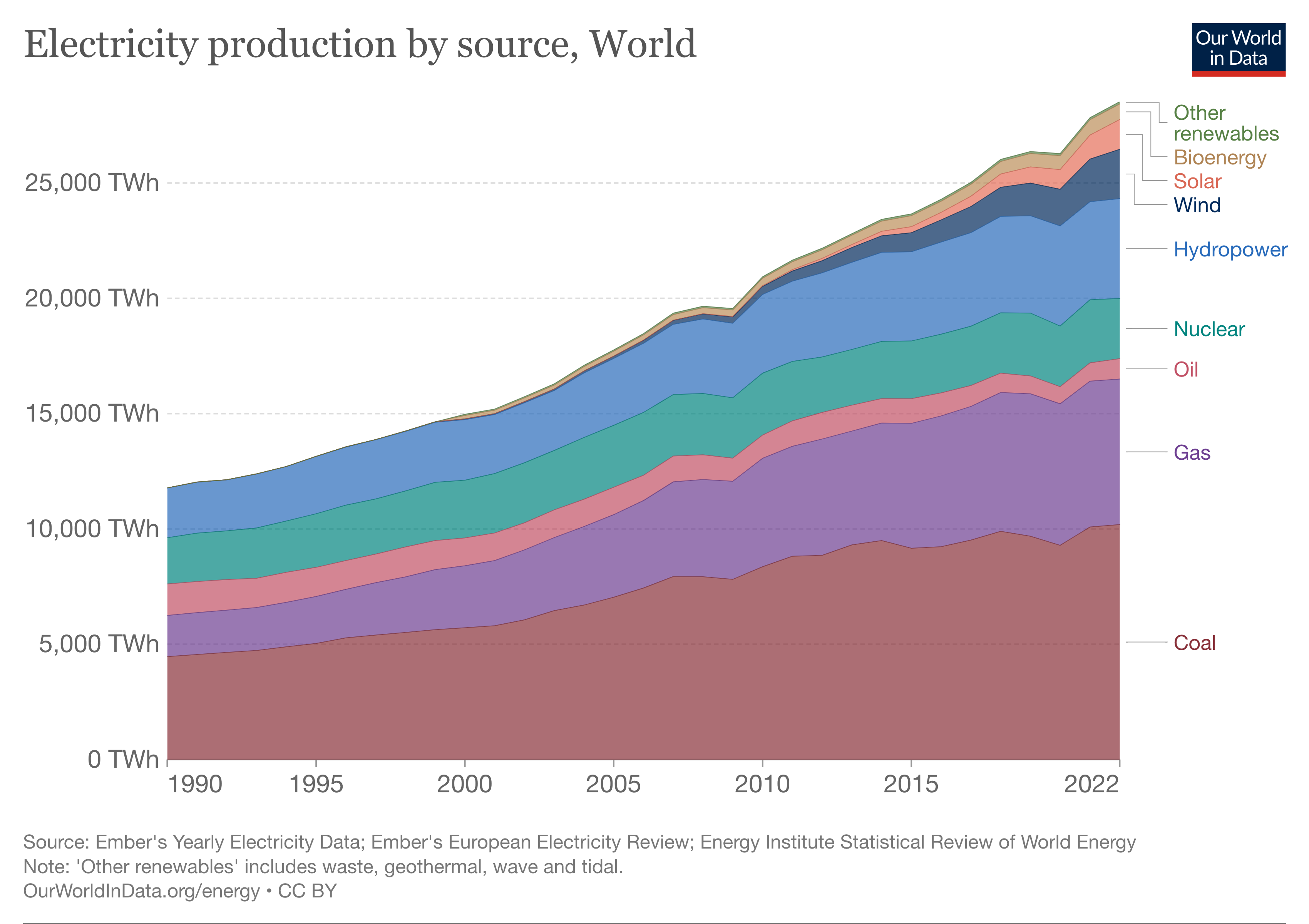 Tittar man på hur den globala energiproduktionen ser ut går det tydligt att se hur både olja, gas och kol är de främsta energikällorna. De står tillsammans för cirka 60 % av den totala energiproduktionen.