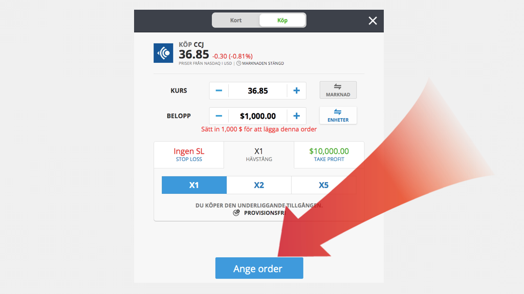Sista steget är att ange beloppet. Klicka därefter på på ”Ange order” för att genomföra din investering.