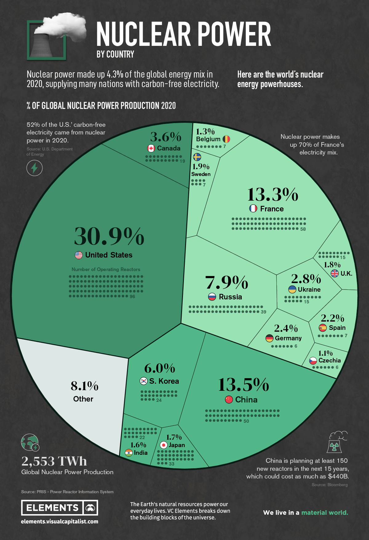 Samtidigt är den totala kärnkraftproduktionen även koncentrerad till ett fåtal länder. USA, Kina och Frankrike står för nästan 60 % av den totala kärnkraftenergiproduktionen, följt av Ryssland, Sydkorea och Ukraina.
