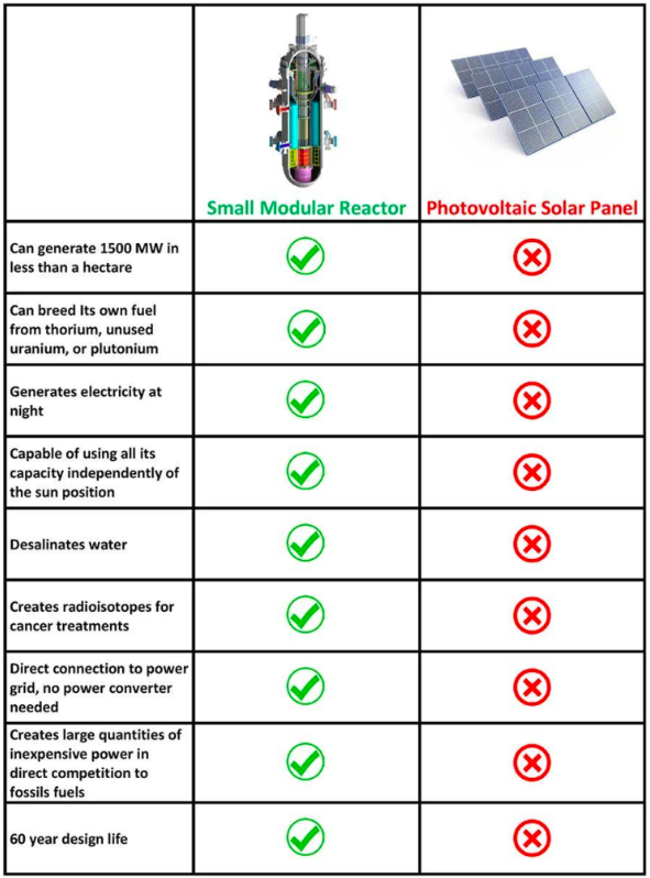 I tabellen nedan jämförs kärnkraften med solenergi. Det går exempelvis att se hur kärnkraft kan generera mer MW på en mindre yta än vad solkraft kan. Vidare ser vi att kärnkraftverk har en högre livslängd än solpaneler.