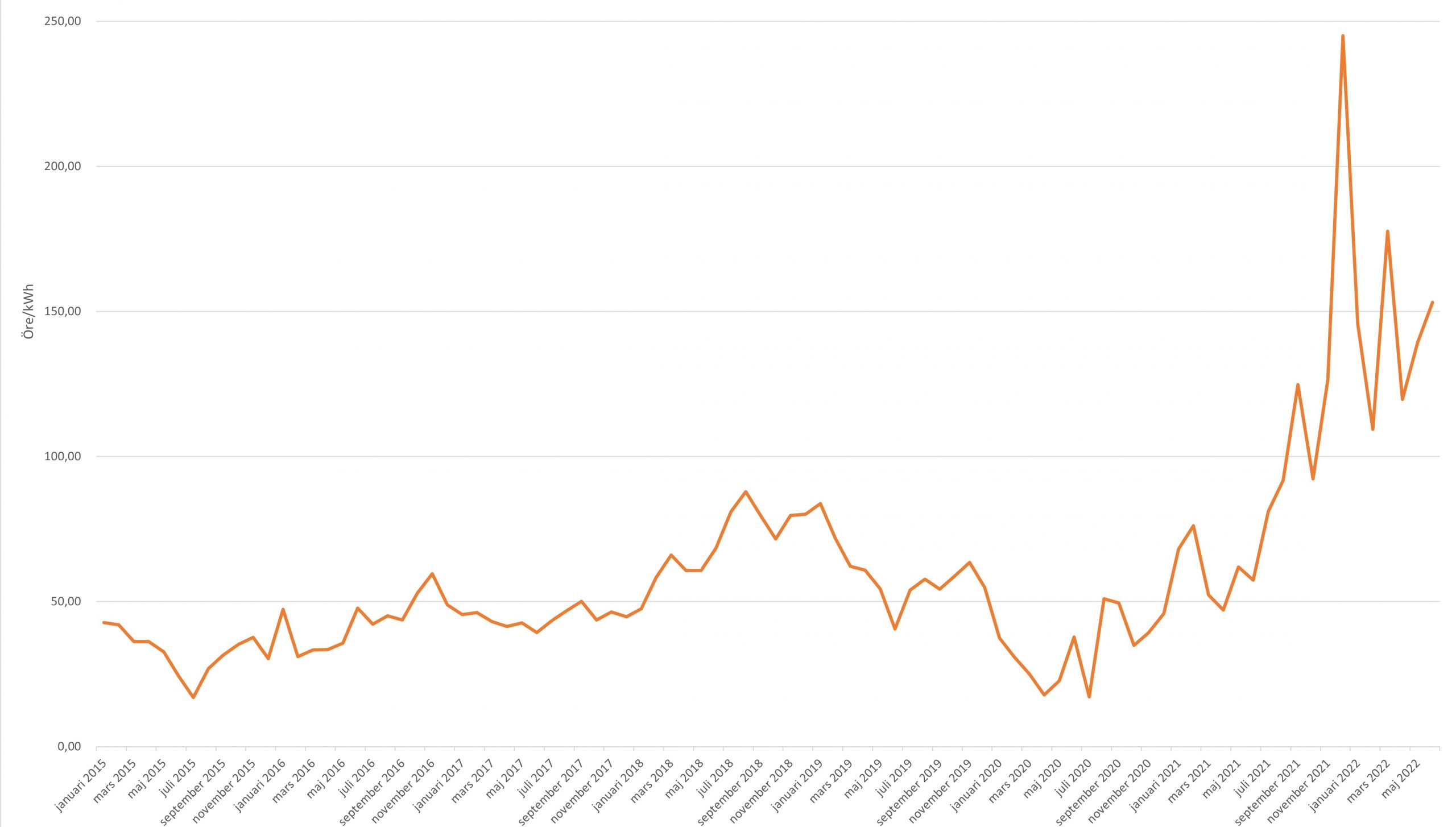 Bilden nedan är tagen från Boo Energi och visar deras rörliga elprisutveckling mellan 2015 och 2022. Priset inkluderar elkraft, elcertifikat, moms och påslag i elprisområdet SE3 (bl.a. ingår Stockholm, Uppsala, Södermanland och Västmanland län).