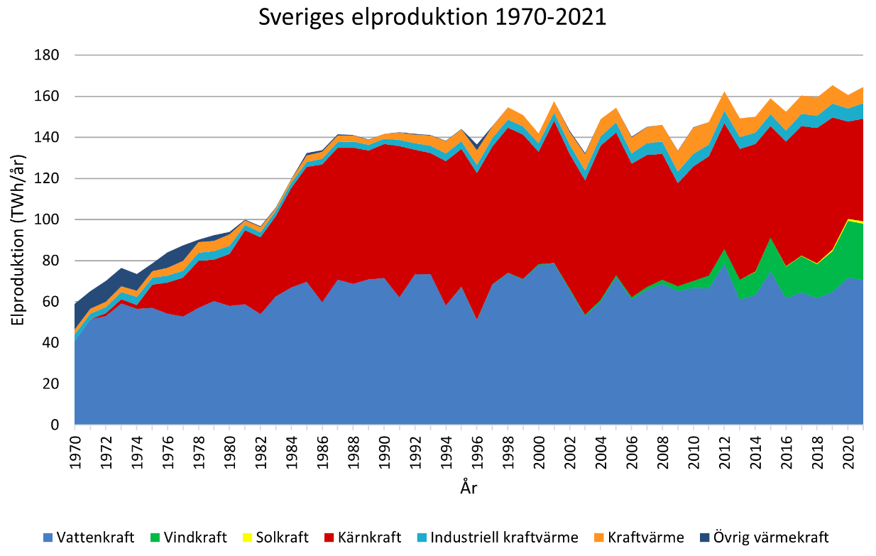 Vindkraft är den energikälla som på senare år vuxit mycket snabbt. Solkraft står fortfarande för endast en blygsam del av den totala energiproduktionen i Sverige. Kärnkraft har däremot spelat en betydande roll för Sveriges energiförsörjning sedan 80-talet.