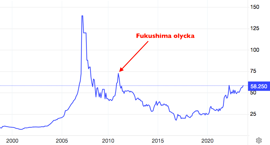 Den lägre efterfrågan på uran ledde till att uranpriset sjönk och därmed även aktiekurser inom branschen. Sedan olyckan har uranpriset och kurserna gått i kräftgång i nästan ett decennium fram till 2020 då man började se ett svagt stigande pristrend igen (se graf nedan). Priset har även fortsatt att stiga 2024 och 2025.
