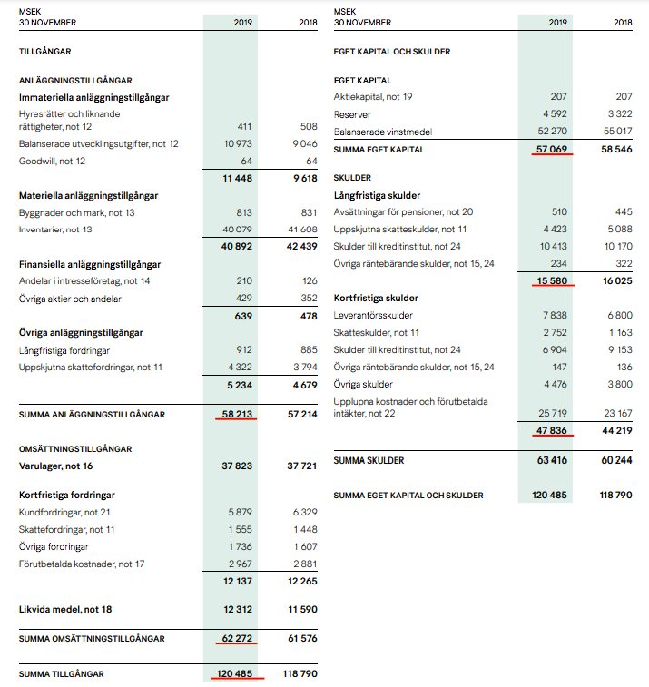 - Tillgångar – Delas upp i olika kategorier beroende på hur långsiktiga de är. Anläggningstillgångar består av exempelvis maskiner, byggnader, mark och immateriella tillgångar. Omsättningstillgångar är mer kortfristiga och omsätts oftast en gång per år. Exempel på omsättningstillgångar är likvida medel (pengar), varulager och kundfordringar.