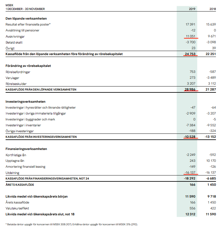 Vad som blir över efter både rörelse- och investeringsverksamhet kan bolaget välja att återinvestera eller dela ut till aktieägare. Vi ser exempelvis att H&M gjorde en utdelning på 16 137 Mkr.