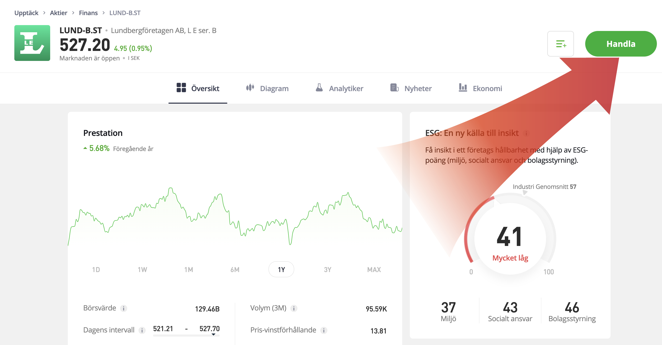 Lundbergs aktie finns att handla hos både eToro och Avanza. Aktien handlas på Stockholmsbörsen under tickersymbolen “LUND B”. Längre ner i denna guide visar vi steg-för-steg hur du handlar aktier i bolaget. Läs mer i kapitel 5.