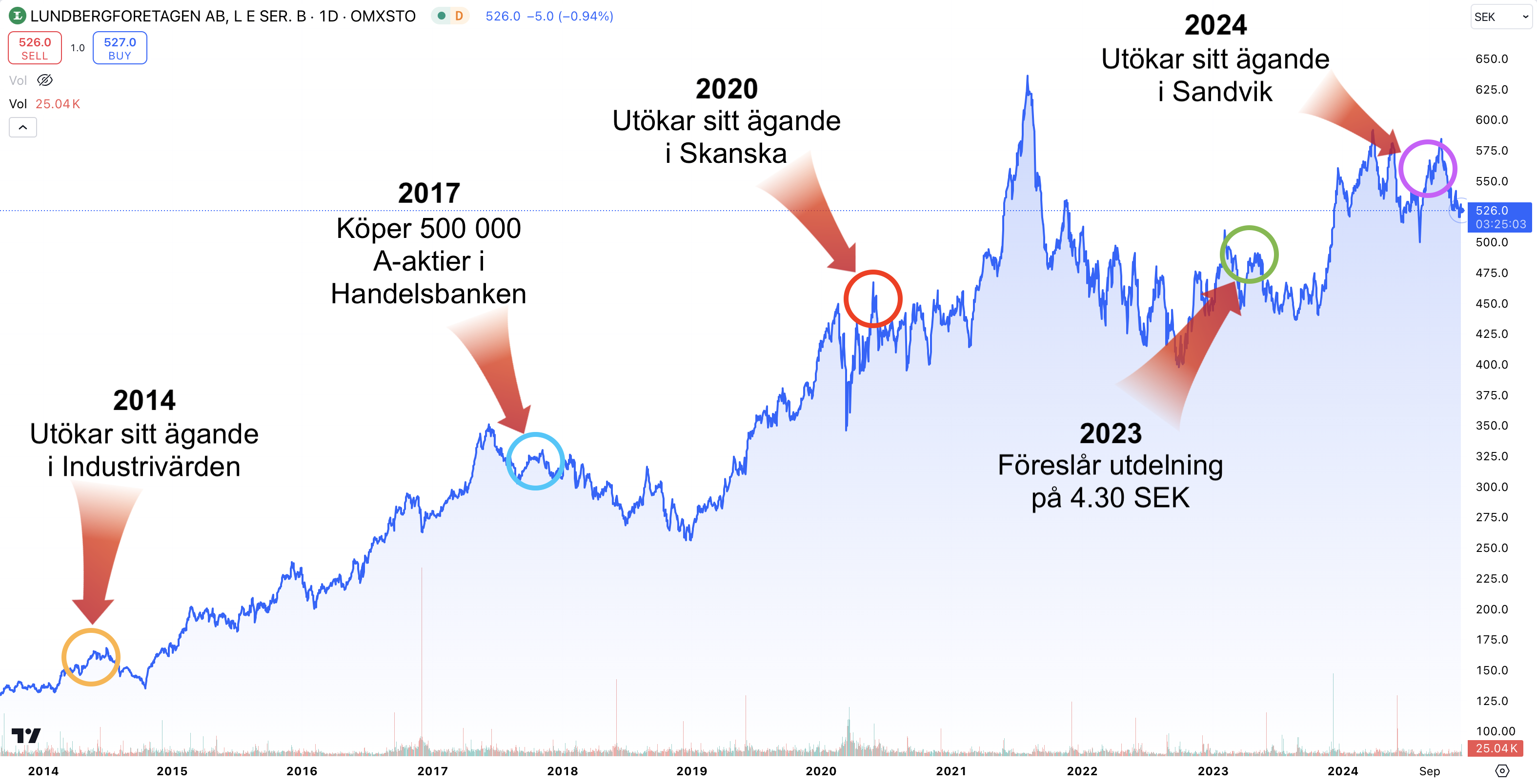 Diagrammet nedan visar hur Lundbergs aktiekurs har förändrats under perioden 2014 till 2024. I diagrammet finns markerade 5 viktiga händelser som påverkat bolagets resultat och aktiekurs. Utförliga beskrivningar av dessa händelser återfinns längre ner i texten.