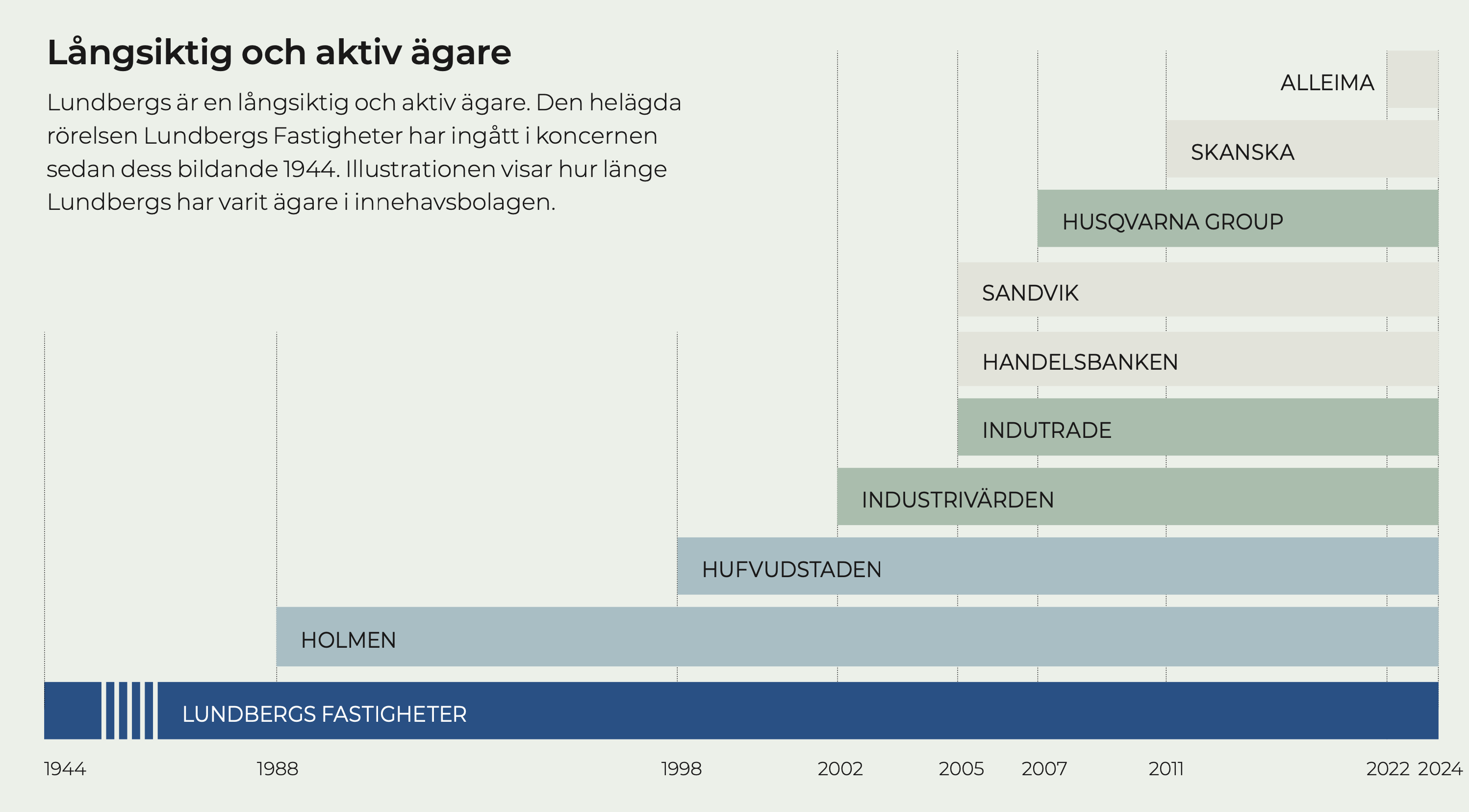 Denna bild illustrerar Lundbergföretagens långsiktiga ägande i olika bolag över tid. Lundbergs Fastigheter har varit en del av koncernen sedan bolaget grundades 1944, vilket markerar starten på deras investeringsresa.