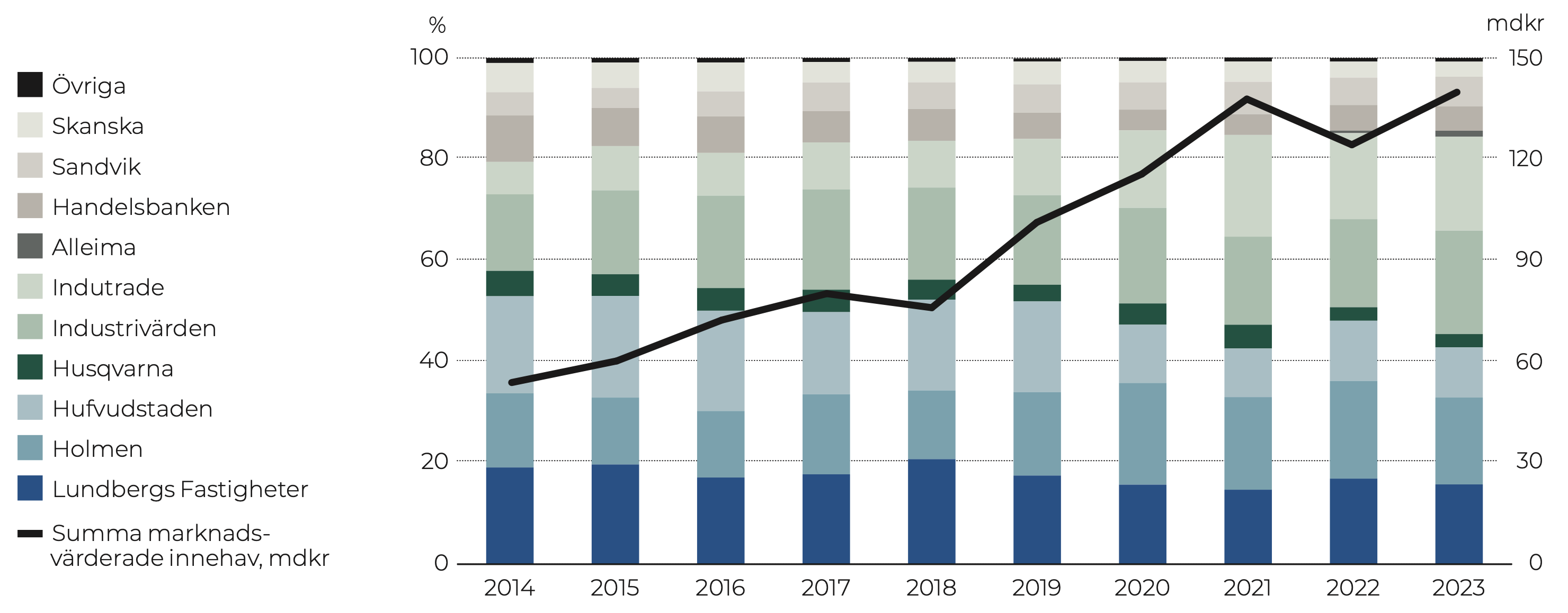 Grafen ovan visar hur Lundbergföretagens innehav har utvecklats i marknadsvärde och andelar mellan 2014 och 2023. Den svarta linjen representerar det totala marknadsvärdet för innehaven i miljarder kronor (mdkr). Den har ökat tydligt över tid och nådde sin högsta punkt år 2023.