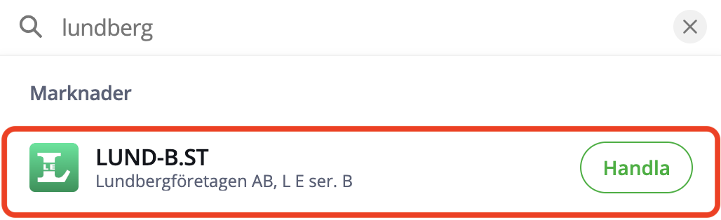 Har du pengar på ditt konto? Då klickar vi på sökknappen, söker efter Lundbergs aktie.