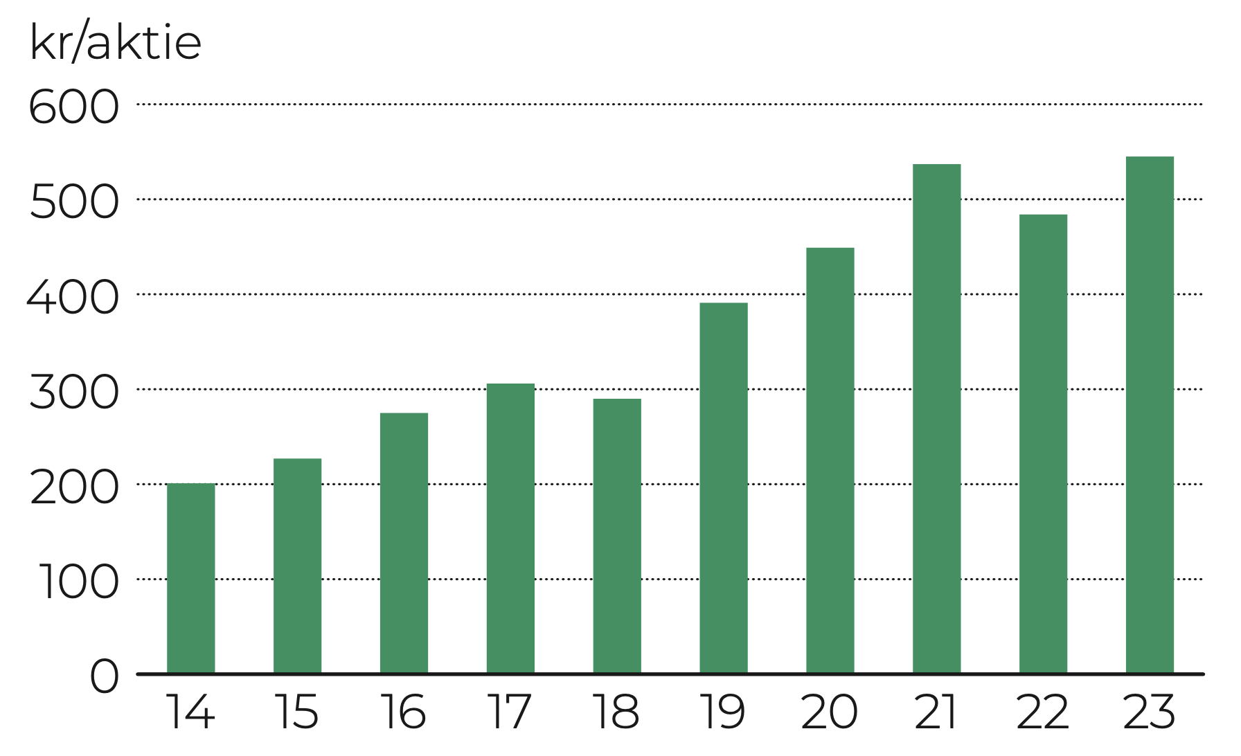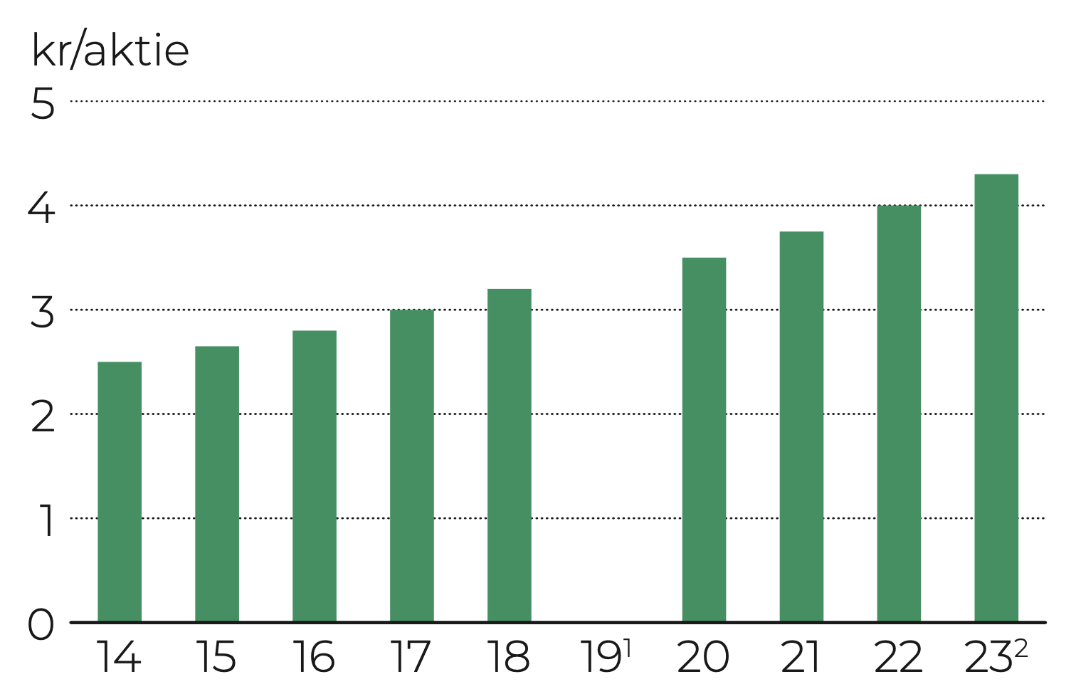 År 2014 uppgick utdelningen till strax över 2.00 SEK per aktie. Den har ökat successivt till att uppgå till 4.30 SEK per aktie 2023. Det är lika med en genomsnittlig tillväxt på cirka 9 % per år. År 2019 var noterbart då ingen utdelning genomfördes, som en följd av Covid-19 pandemin.