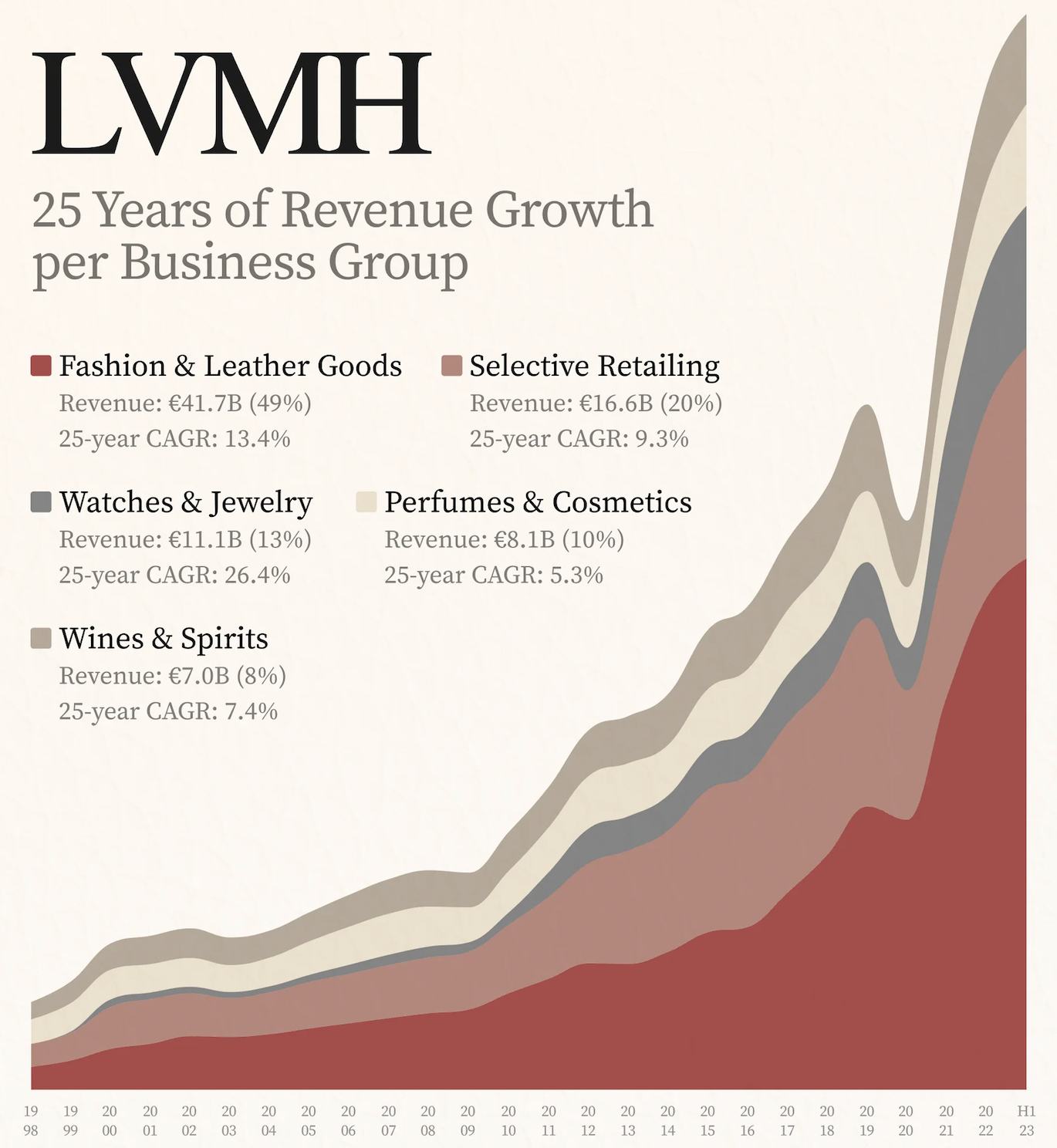I bilden ovan går att se vad respektive affärssegment genererat i intäkter över tid. Det går exempelvis att se hur ”Fashion & Leather Goods” utgör störst andel av bolagets totala omsättning på totalt 49 %. Ett annat viktigt affärssegment är ”Selective Retailing” som utgör cirka 20 % av den totala omsättningen.