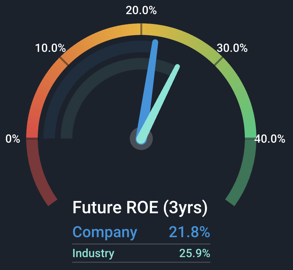 Vidare spås bolaget ROE (return on equity) öka i framtiden. Det vill säga, avkastning från investerat eget kapital. Bilden nedan visar framtidsprognoser gällande bolagets ROE.