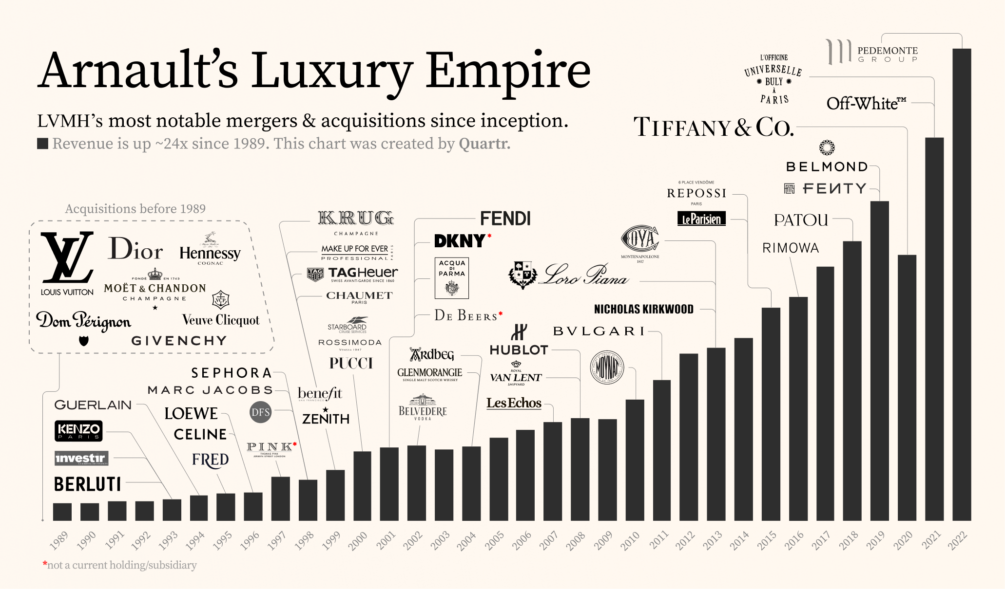 Stapeldiagrammet ovan visar ala bolagsförvärv som LVMH gjort sedan 1989. Hittills har bolagets framgångsrikt lyckats förvärva flertalet lyxvarumärken och implementera dessa till sin egna kärnverksamhet. Några av de största förvärven man gjort genom åren är Dior, Krug, Tiffany & CO och Belmond. Läs mer i kapitel 4.