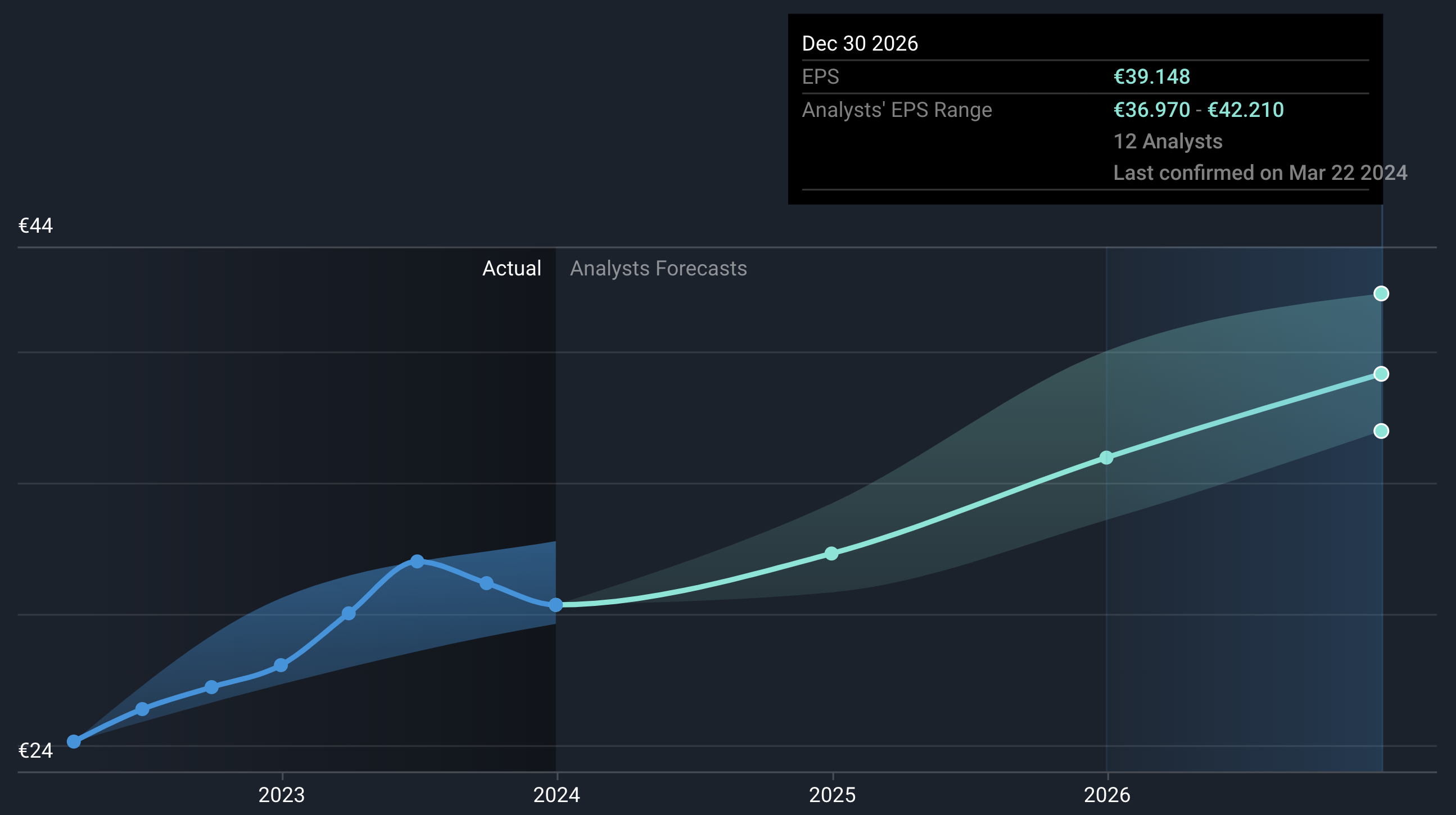 Simply Wall St sammanställer ständigt data och analyser utifrån en samlad grupp aktieanalytiker. Nedan kan du se prognoserna för LVMH:s vinsttillväxt från 2024 fram till 2026.