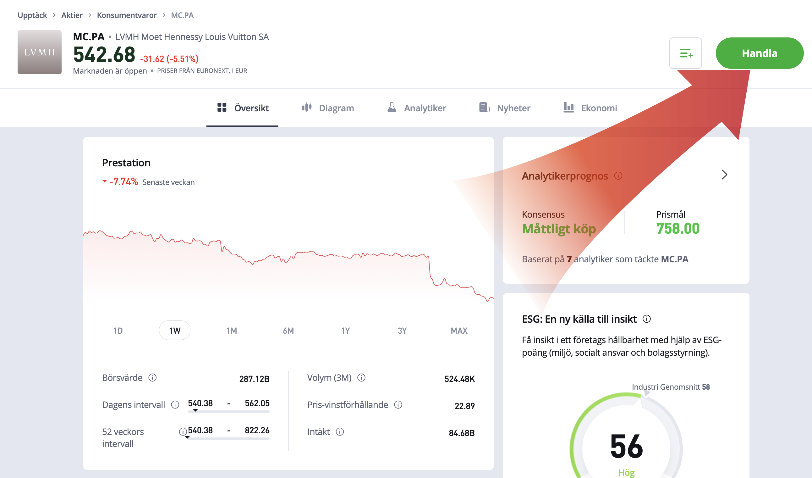 LVMH går att handla hos en svensk eller utländsk aktiemäklare. Inom Sverige är de mest populära Avanza och Nordnet. Inom urvalet av utländska aktiemäklare är både eToro och Degiro populära. Läs mer i kapitel 5.