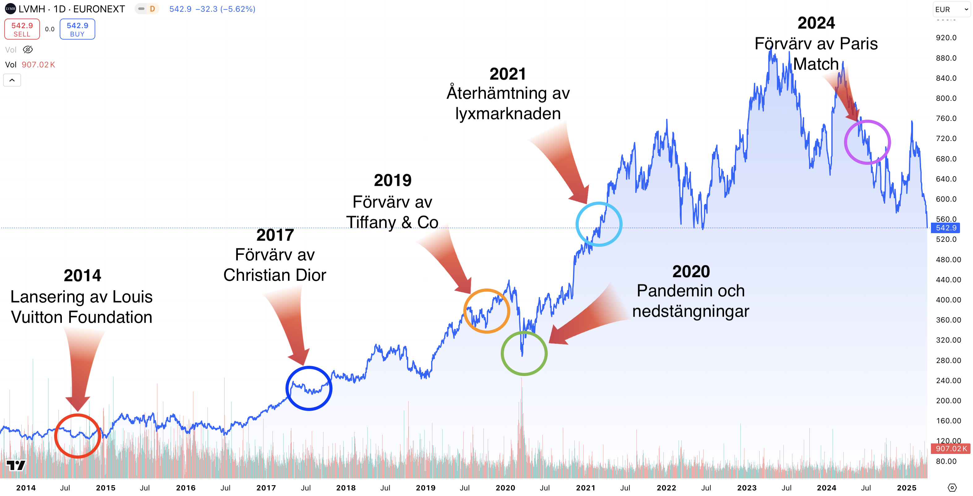 Grafen ovan visar på LVMH:s aktiekursutveckling mellan 2014 och 2025. Markerat med pilar presenteras historiskt viktiga ögonblick som varit avgörande för bolaget och dess aktiekurs. Bland annat innebar Covid-19 pandemin att LVMH:s aktie sjönk drastiskt på börsen som en effekt av att våra samhällen tillfälligt stängdes ner. Läs mer i kapitel 1.