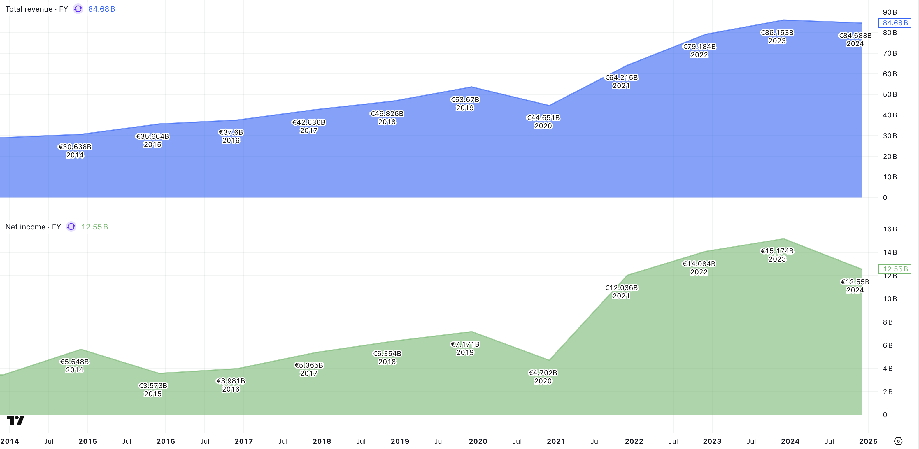 År 2014 uppgick bolagets omsättning och vinst till 30,64 miljarder EUR, respektive 5,65 miljarder EUR. Tio år senare, år 2024, uppgick dessa siffror istället till 84,68 miljarder EUR och 12,55 miljarder EUR. Det motsvarar en ackumulerad genomsnittlig tillväxttakt på cirka 11 % respektive 8 % per år.