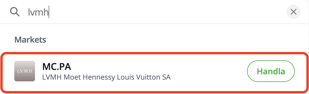 Har du pengar på ditt konto? Då klickar vi på sökknappen, söker efter LVMH aktie.