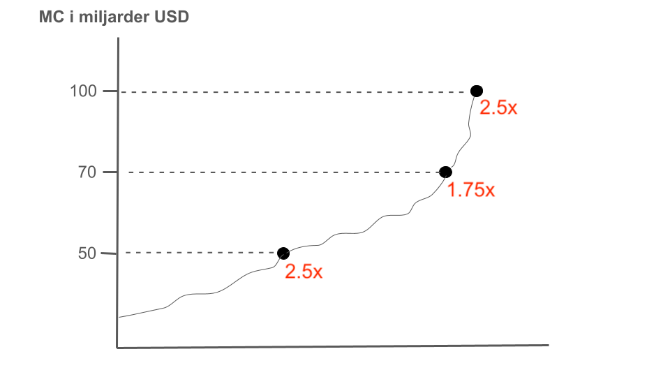 MicroStrategy har alltså genom en enkel ATM lyckats minska “gapet” mellan sin egen värdering och värderingen av deras Bitcoin-position. För att “gapet” ska förbli detsamma krävs att bolagets värdering ökar till 100 MC, vilket återigen ger en multipel på 2.5x (100 / 40). Se bilden nedan.