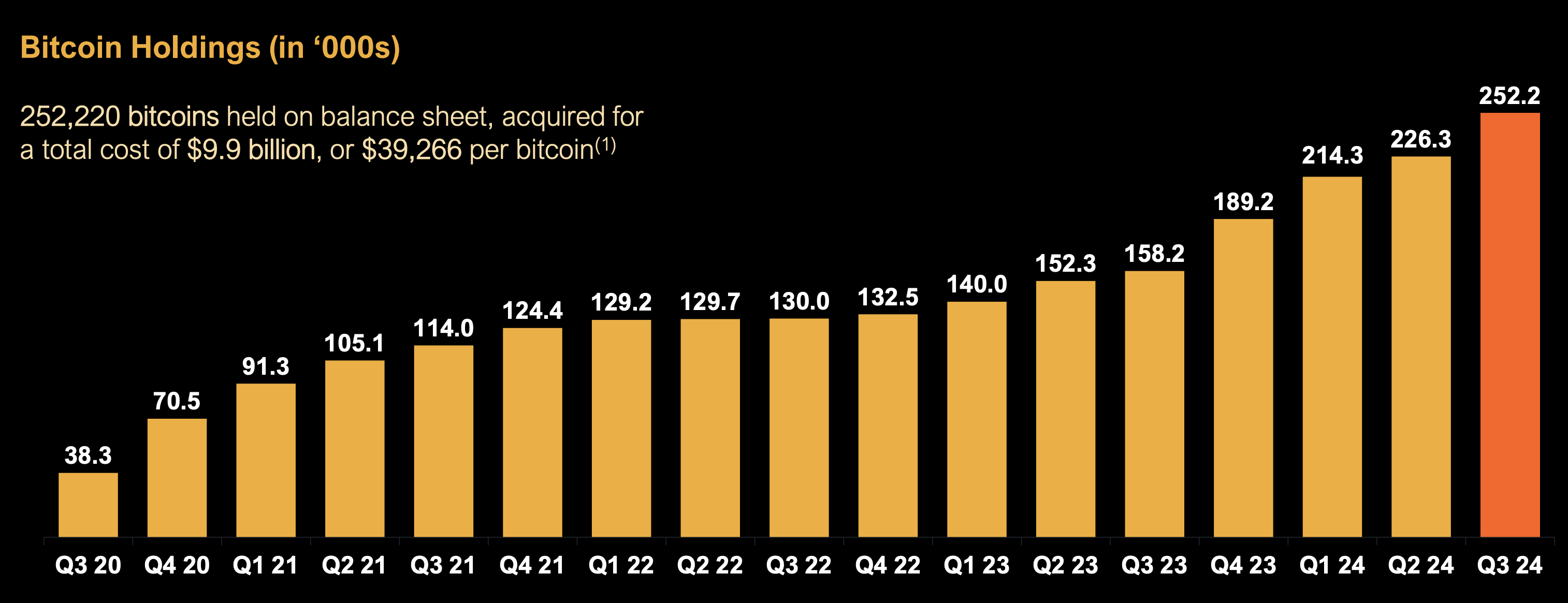 Grafen ovan illustrerar MicroStrategys totala innehav av bitcoin över tid. När företaget gjorde sin första investering år 2020 förvärvade de totalt 38 300 BTC. Fram till Q3 2024 har deras innehav vuxit till 252 200 BTC. Det motsvarar en genomsnittlig ökning på cirka 60 % per år. Läs mer i kapitel 4.