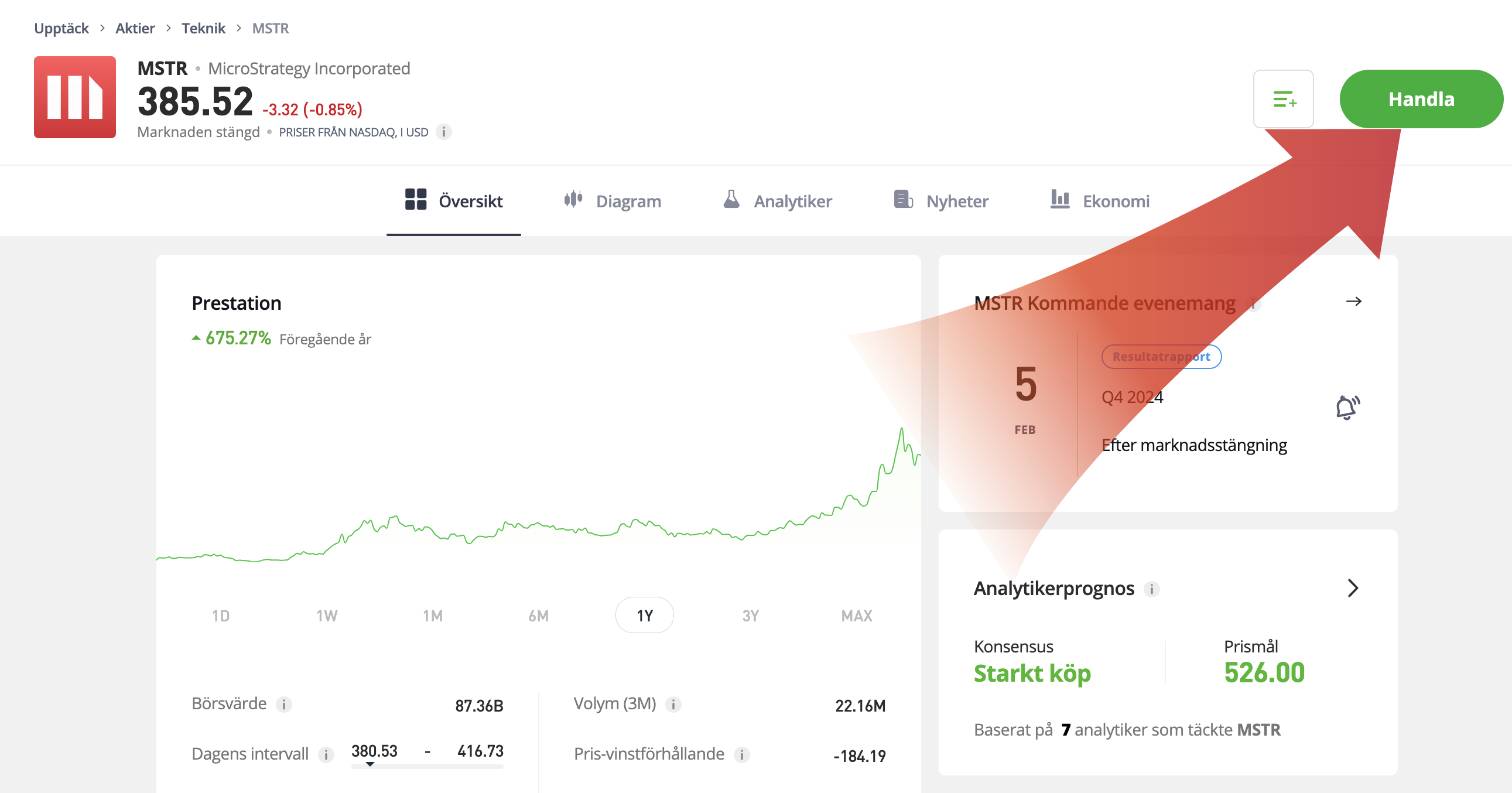 MicroStrategy kan handlas hos både eToro och Avanza. Bolaget är noterat på Nasdaq i USA under tickersymbolen “MSTR”. Längre ner i denna guide visar vi hur du steg-för-steg köper aktier i bolaget. Läs mer i kapitel 5.
