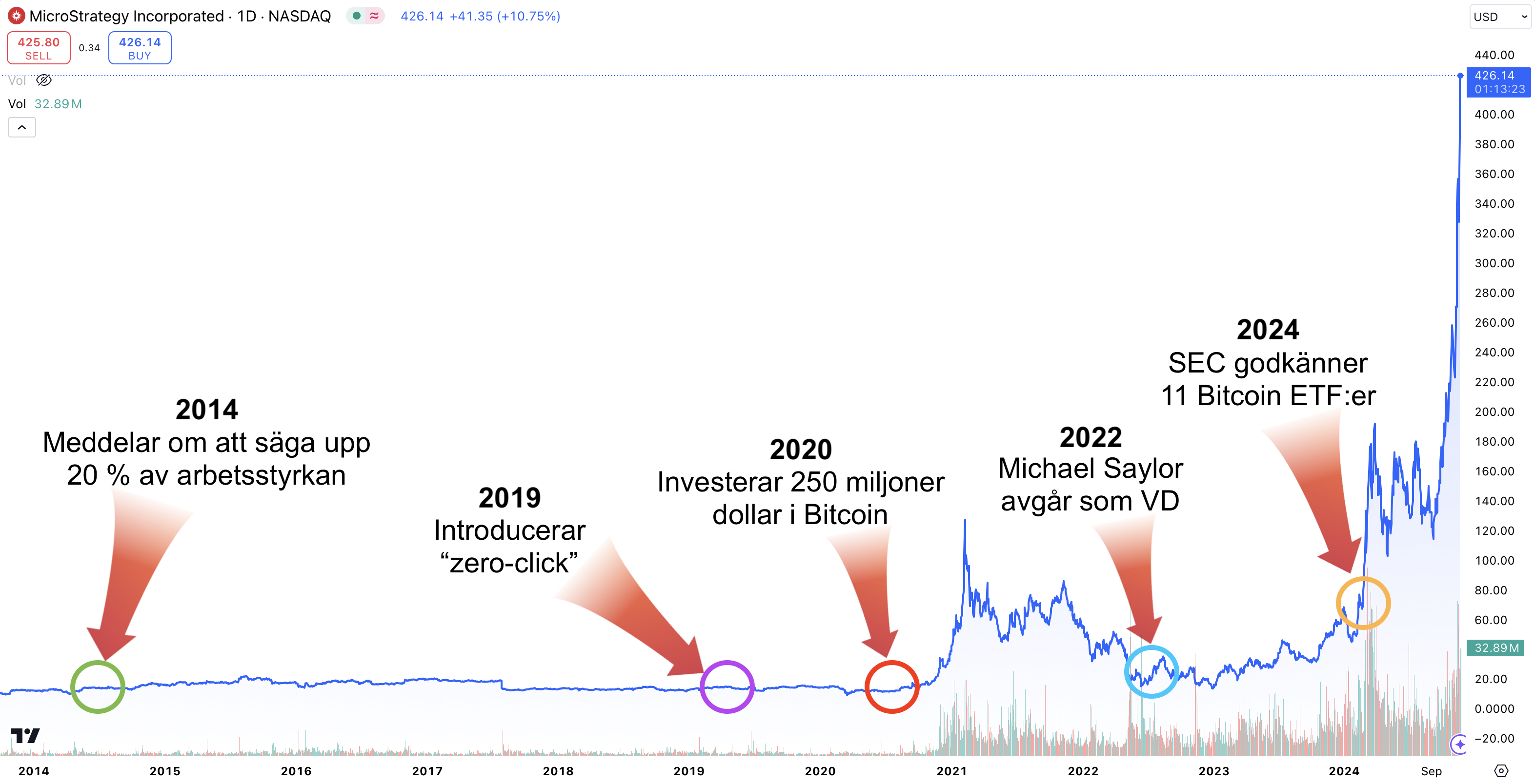 Nedan visas en sammanställning av MicroStrategys aktiekursutveckling mellan 2014 och 2024. I grafen finns även 5 viktiga bolagshändelser inkluderade som anses ha varit avgörande för bolagets framgång och aktiekurs. Dessa går att läsa mer om längre ner i texten.