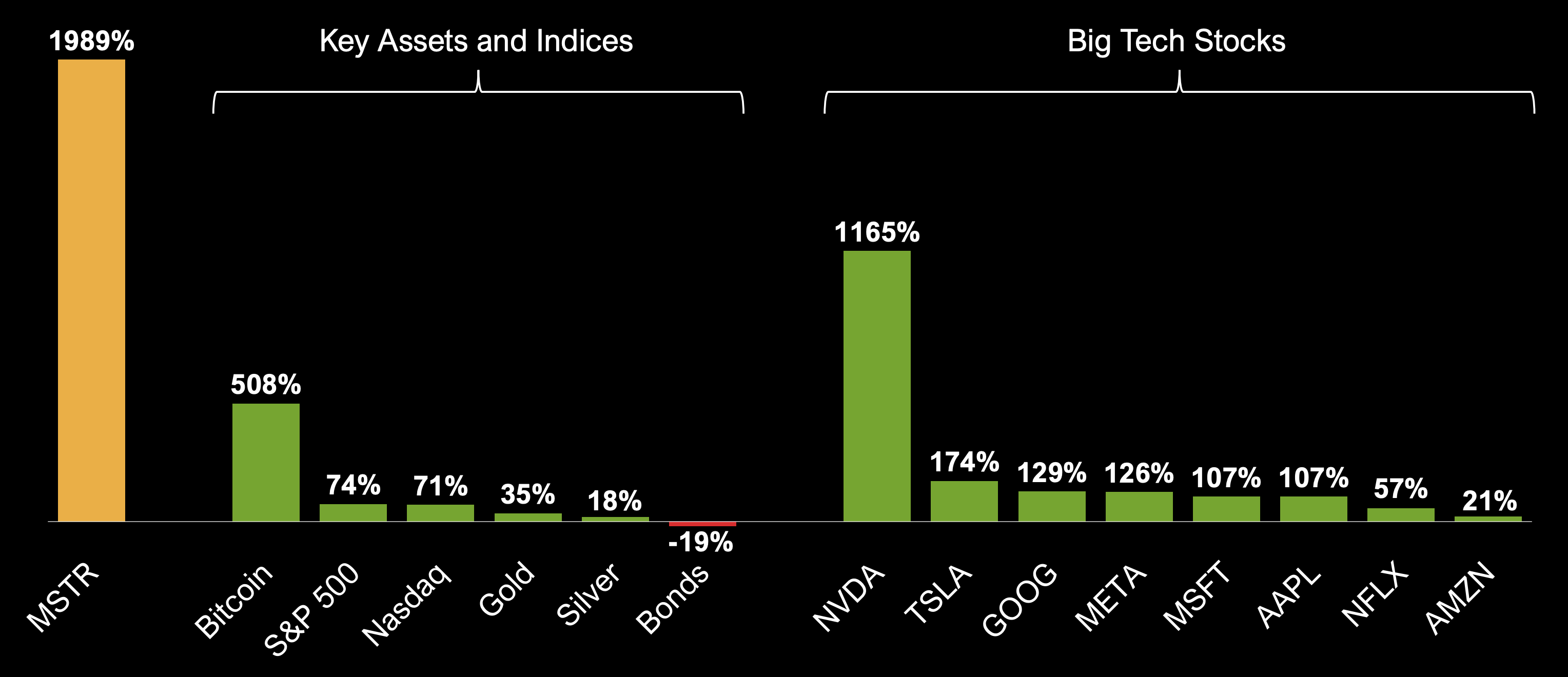 Bilden visar exempelvis hur man presterat bättre än Nvidia och även Bitcoin självt. Dessa tillgångar har under perioden givit avkastningar på 1 165 % respektive 508 %. MSTR har givit en avkastning på totalt 1 989 % under samma period.