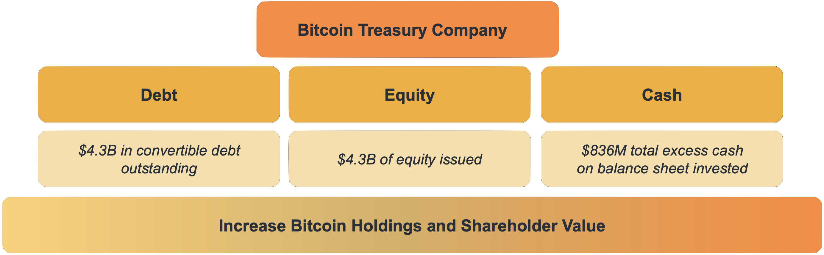 För att finansiera sina Bitcoinköp tar MicroStrategy in kapital på 3 olika sätt – “Cash”, “Equity” och “Debt”. Nedan visas i detalj hur de tar in kapital från respektive metod.