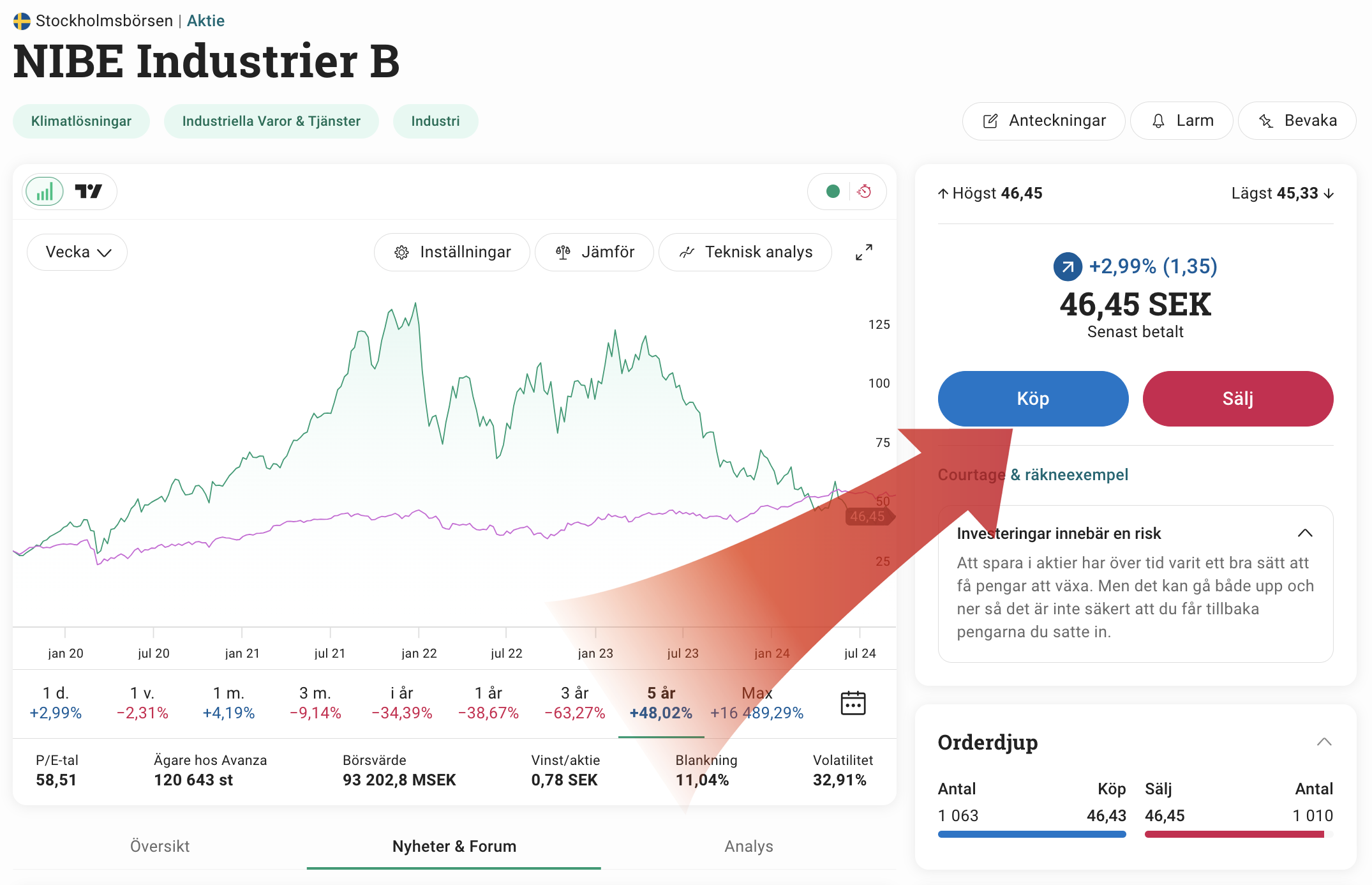 NIBE Industriers aktier kan handlas hos både eToro och Avanza. Bolaget finns noterat på Stockholmsbörsen under kategorin “Large Cap”. Längre ner visas steg-för-steg instruktioner för hur du investerar i bolaget. Läs mer i kapitel 5.