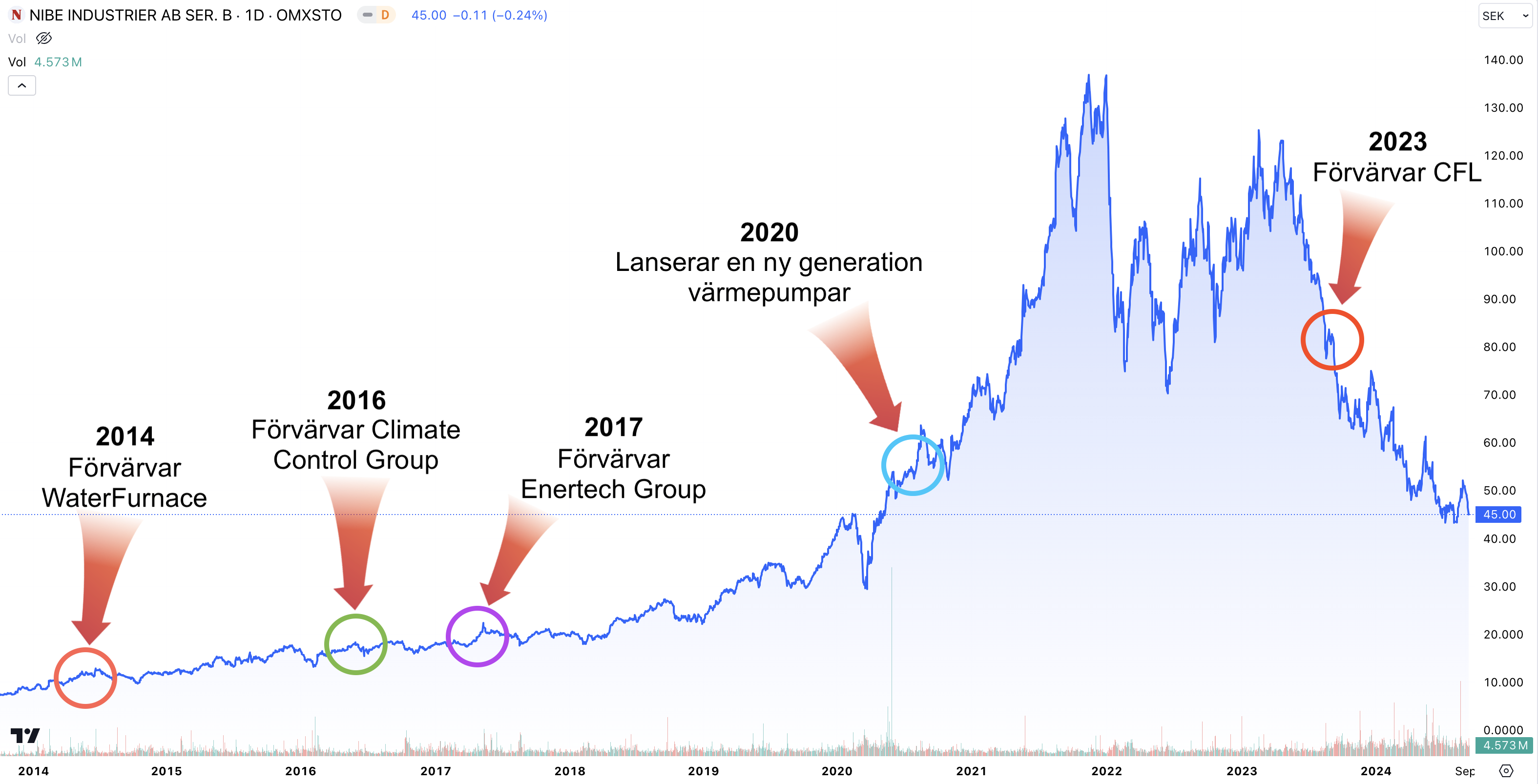 Detta kapitel ger en överblick av NIBE:s aktiekursutveckling under perioden 2014 till 2024. I diagrammet nedan visas totalt 5 viktiga händelser som har haft en betydande påverkan på bolagets resultat och aktiekurs. Utförligare genomgång av dessa händelser finns att läsa nedanför diagrammet.