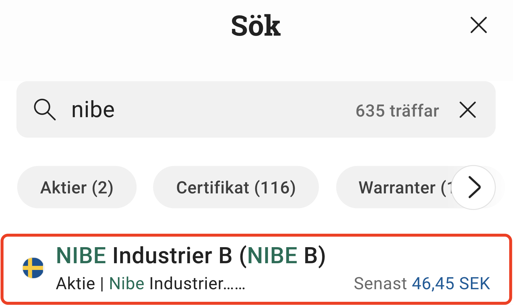 Har du pengar på ditt konto? Då klickar vi på sökknappen, söker och väljer NIBE Industrier.