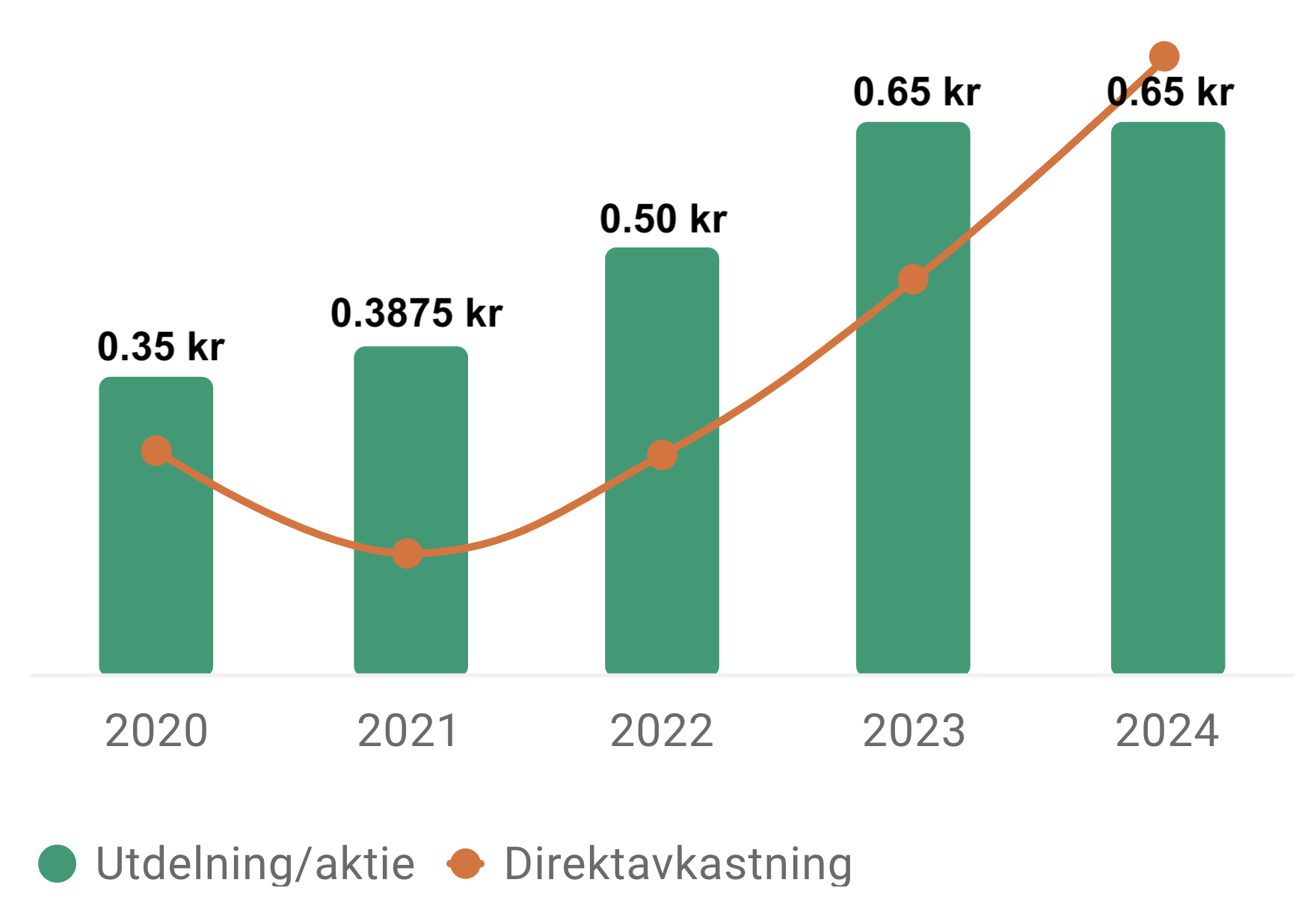 För år 2025 föreslog styrelsen en utdelning på 0.30 SEK per aktie. Det är betydligt lägre än vad den uppgått till historiskt. Det beror på de försämrade vinstresultatet under år 2024.