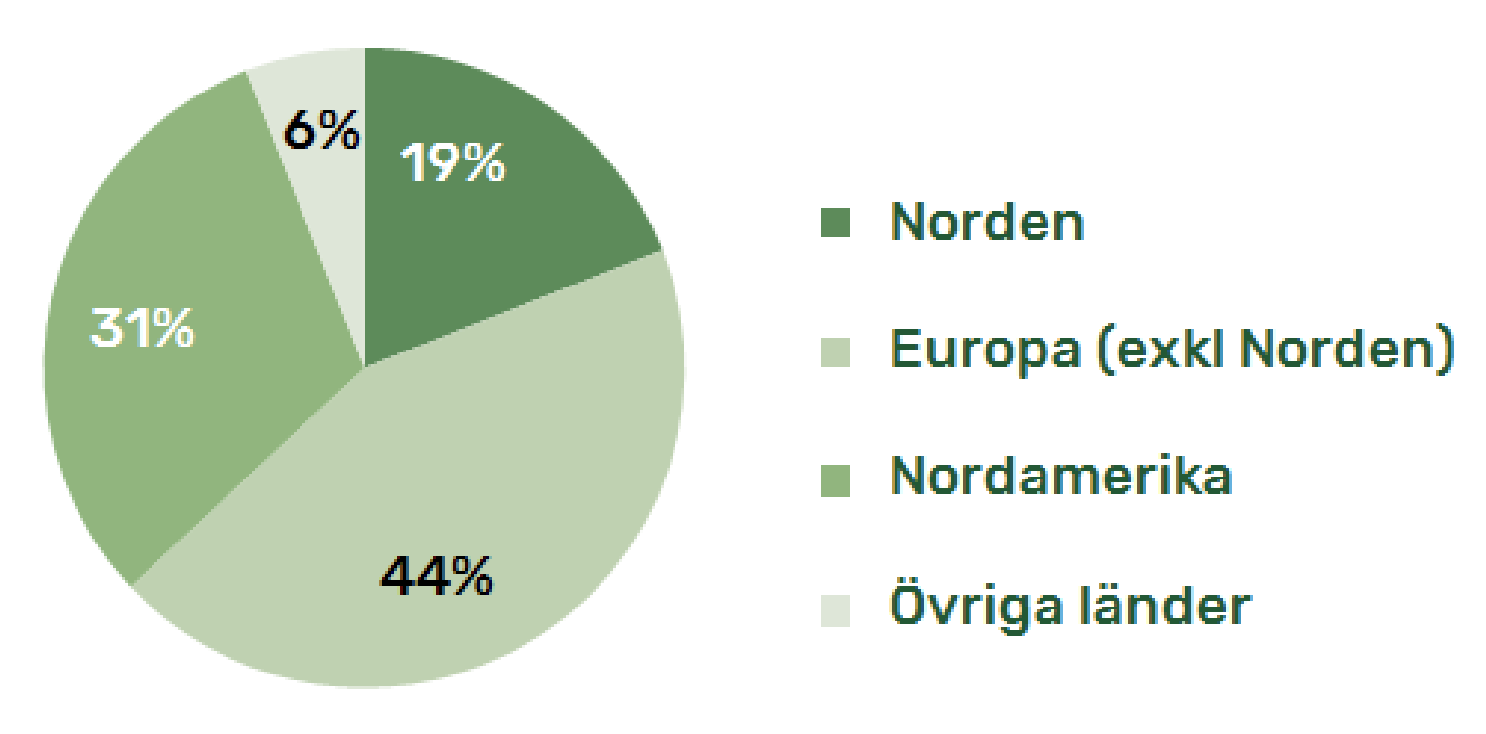 Bilden ovan visar att Europa är NIBE:s viktigaste geografiska område som står för 44 % av bolagets intäkter. Den näst största marknaden utgörs av Nordamerika på 31 %, följt av Norden på 19 % och resterande länder på endast 6 %.