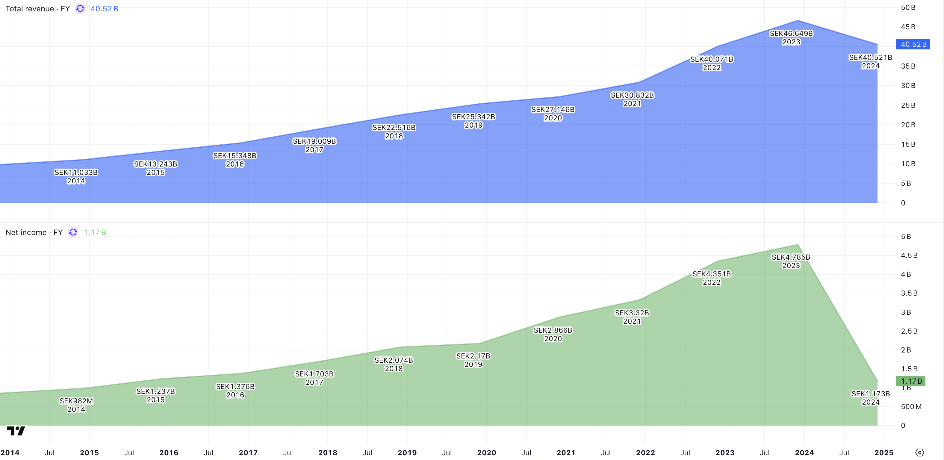 Det blåa fältet ovan representerar omsättningsutvecklingen. År 2014 uppgick intäkterna till totalt 11 mdkr. År 2024 redovisade NIBE intäkter på cirka 41 mdkr. Det är lika med en ackumulerad omsättningstillväxt på 14 % per år.