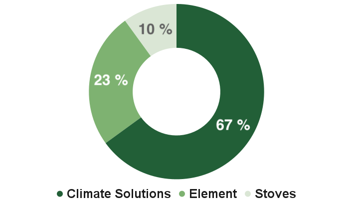 Bilden ovan visar att “Climate Solutions” är det absolut största segmentet som står för 67 % av bolagets intäkter. Det näst största segmentet är “Element” som utgör 23 % av intäkterna, följt av “Stoves” på 10 %.