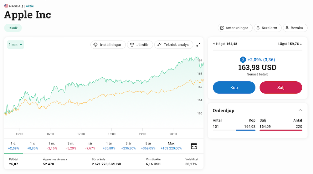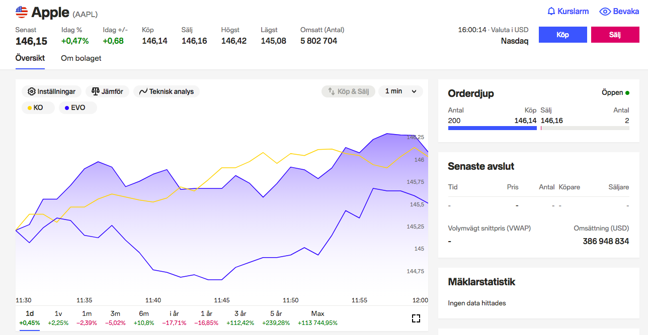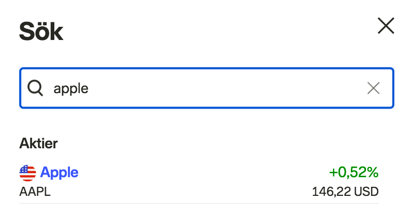 Har du pengar på ditt konto? Då klickar du på sökknappen, söker och väljer ett värdepapper. I detta exempel väljer vi att söka efter Apple →