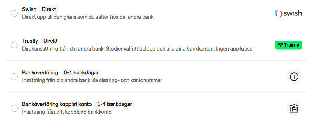 Är du inloggad? Nu är det dags att sätta in pengar för att handla med. Klicka på ”Mina Sidor” -> ”Insättningar & Uttag” -> ”Sätt in pengar”. Här kan du välja mellan Trustly eller vanlig banköverföring. Vi rekommenderar Trustly, det tar några sekunder och är gratis!