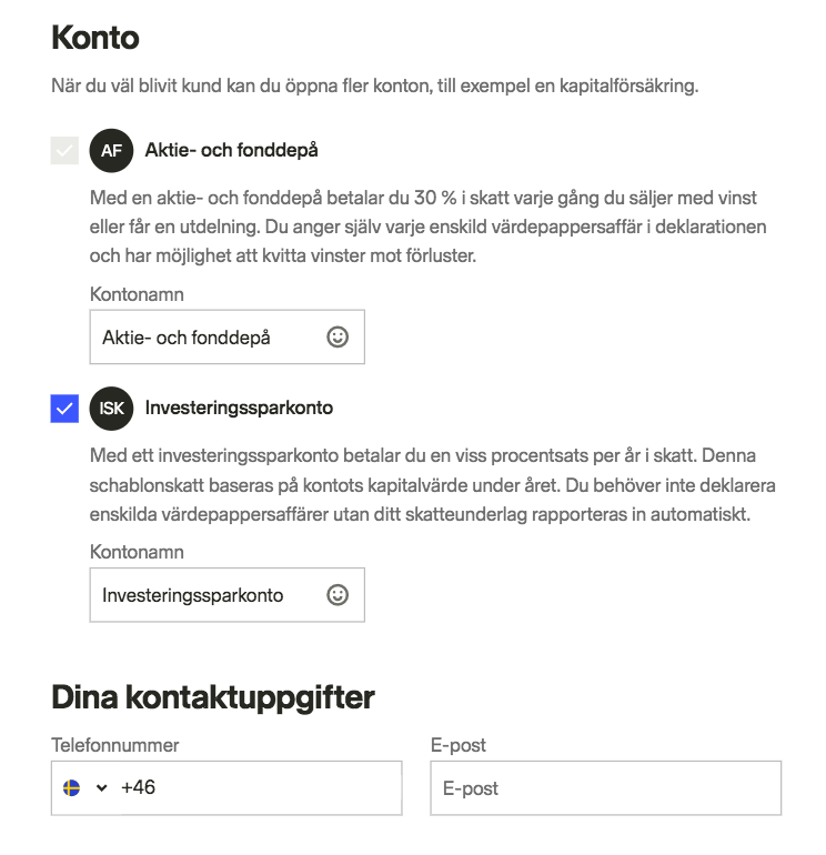 Nästa steg är att fylla i vilket typ av konto du villa öppna samt kontaktuppgifter och din erfarenhet av handel med värdepapper. Detta tar bara några minuter. När du är klar loggar du in på ditt konto med hjälp av BankID eller användarnamn och lösenord →