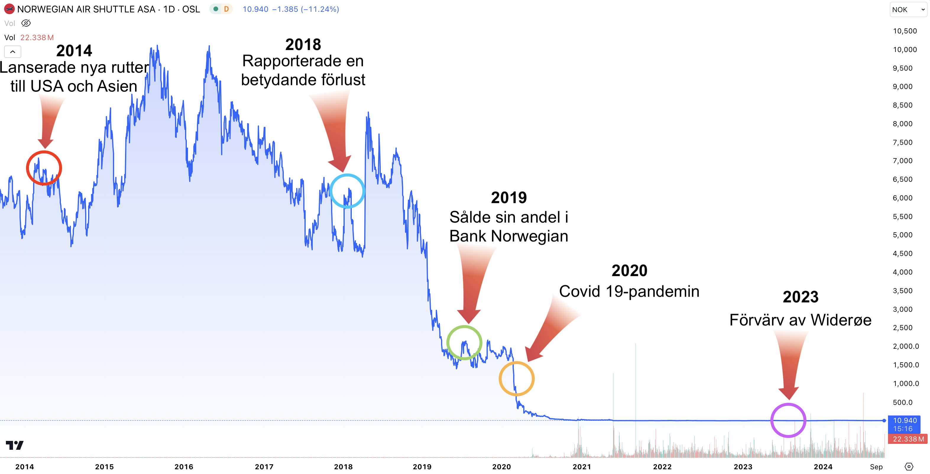 I början av 2014 var en Norwegian-aktie värderad till 5 230 norska kronor (NOK). I början av 2024 hade aktiekursen sjunkit till cirka 11 NOK. Detta motsvarar en avkastning på – 99.79 %. Hade man investerat i aktien hade man alltså förlorat i stort sett alla sina pengar.