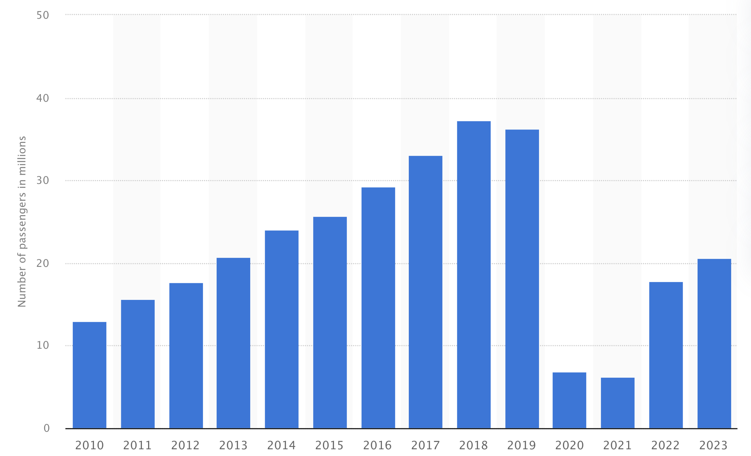 Värt att notera är det stora tappet mellan år 2019 och 2020. Som redan tidigare nämnt kom tappet som en konsekvens av Covid 19-pandemin. Det totala antalet passagerare sjönk då från 36,2 till 6,9 miljoner. Det är lika med ett tapp på strax över 80 %.