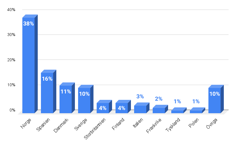 - Spanien – Den näst största marknaden utgörs av Spanien som står för 16 % av intäkterna. Intäkterna uppgick till 5,650 miljarder NOK, vilket var en ökning jämfört med föregående år.