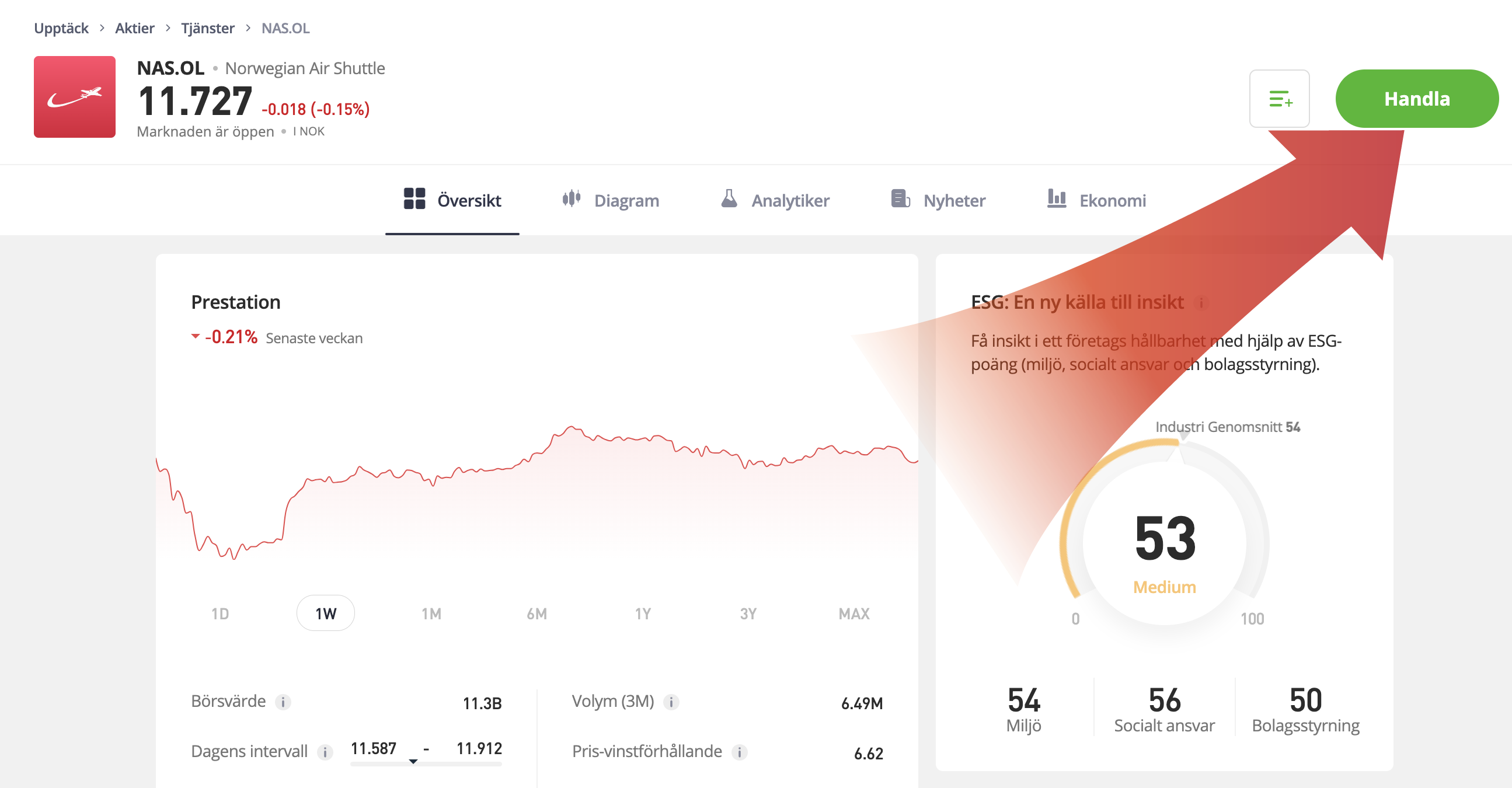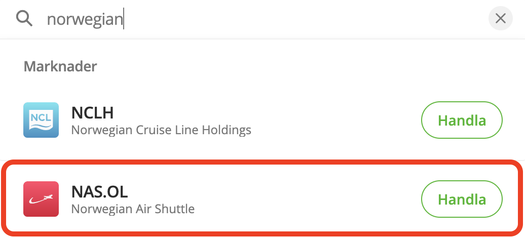 Norwegian Air Shuttle finns att handla hos både eToro och Avanza. Aktien är noterad på Oslobörsen under tickern “NAS”. Längre ner i denna guide presenteras steg-för-steg hur du köper aktier i bolaget. Läs mer i kapitel 5.