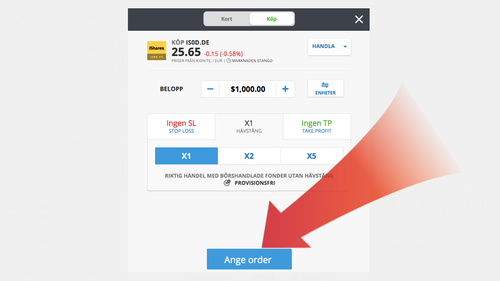Sista steget är att ange beloppet. Klicka därefter på på ”Ange order” för att genomföra din investering.