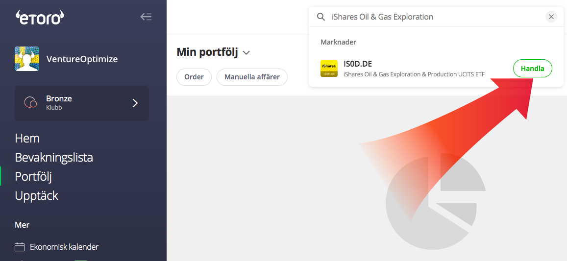När du har pengar på ditt konto kan du välja en investering. I detta exempel väljer vi att köpa andelar i ETF:en ”iShares Oil & Gas Exploration & Production ETF” genom att klicka på köpknappen.