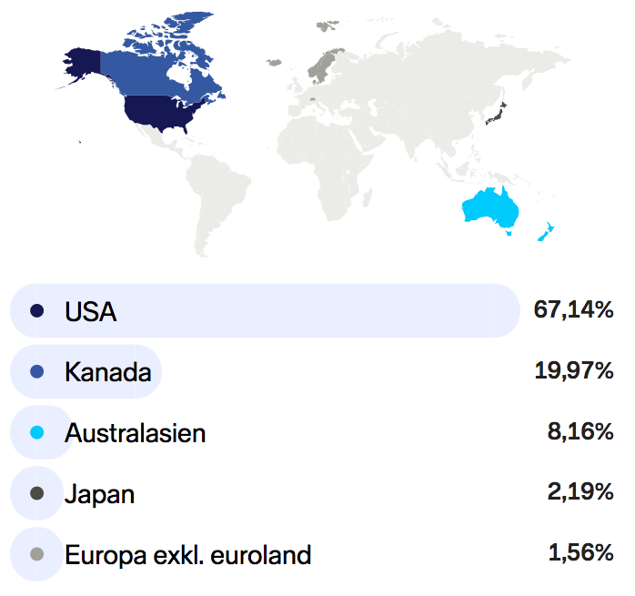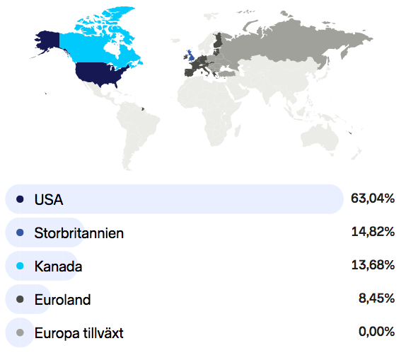 Tabellen ovan visas mot vilka länder som fonden hade störst exponering mot i början av 2025. Bolag etablerade i USA och Kanada stod för störst andel av fondens totala portfölj.