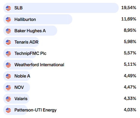 I tabellen ovan visas fondens största innehav. De tre största innehaven var i början av 2025 SLB, Halliburton och Baker Hughes.