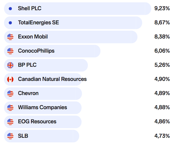 I tabellen ovan visas fondens största innehav. De tre största innehaven var i början av 2025 Shell PLC, TotalEnergies och Exxon Mobil.