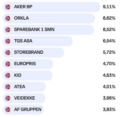 Exponeringen mot Norge står för cirka 96 % och Storbritannien för cirka 4 %. Ett av de största företagen i fondportföljen var Aker BP. Det är ett norskt bolag etablerat inom olje- och gassektorn. Det arbetar bland annat med produktion och raffinering av olja.