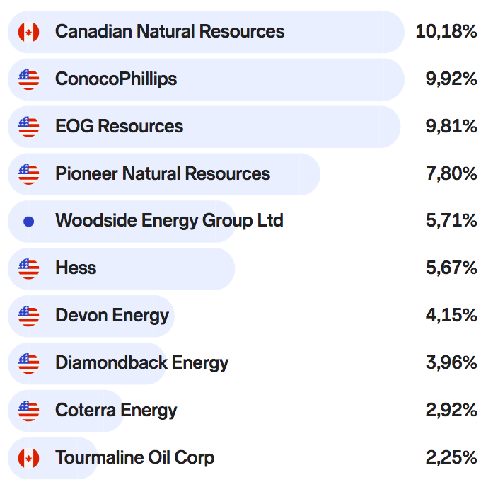I tabellen ovan visar fondens största innehav. De tre största innehaven var i början av 2025 Canadian Natural Resources, ConocoPhillips och EOG Resources.